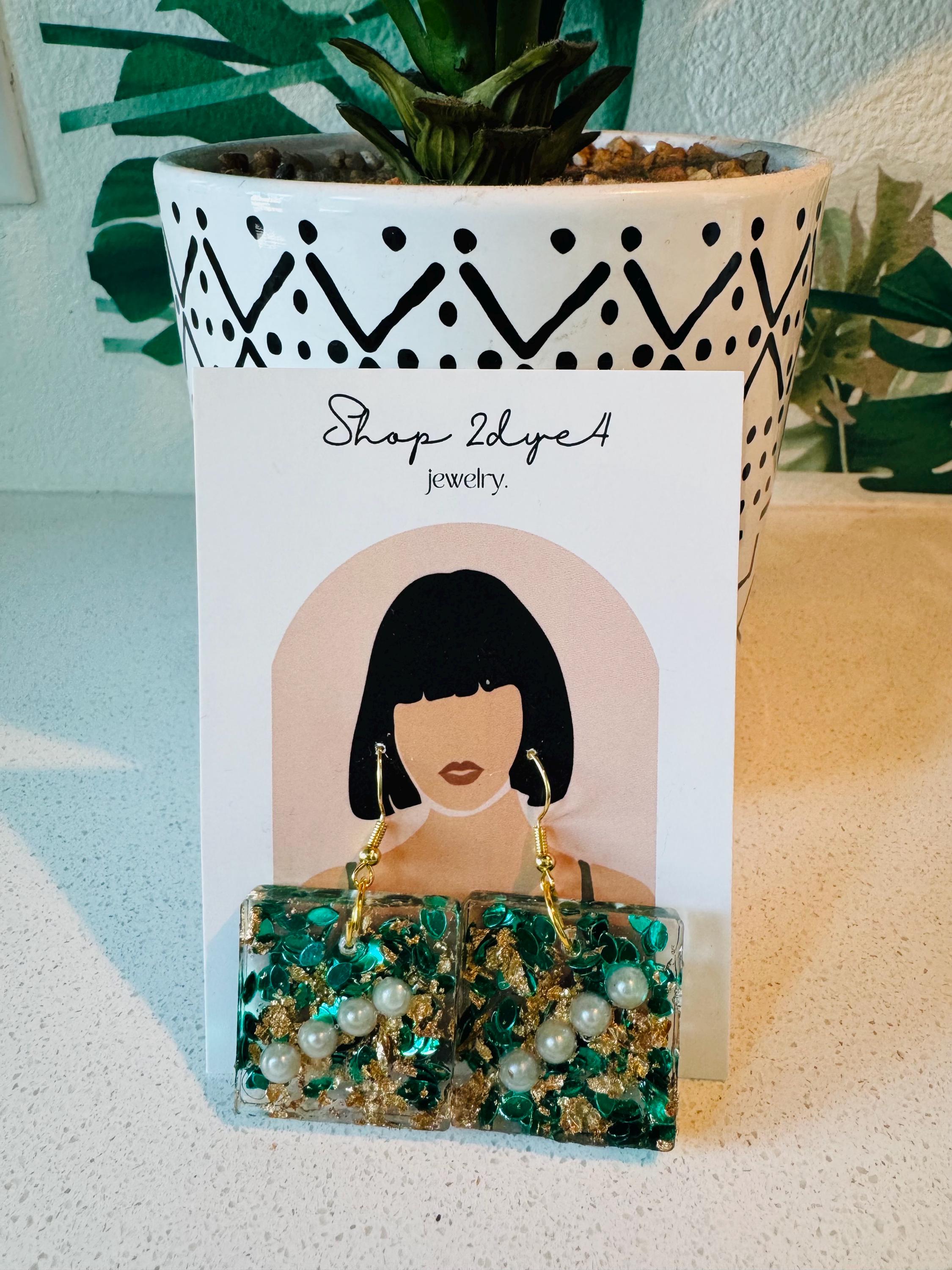 Featuring a modern square resin base, infused with shimmering emerald green accents, flecks of radiant gold foil, and a row of delicate pearls for a touch of elegance.