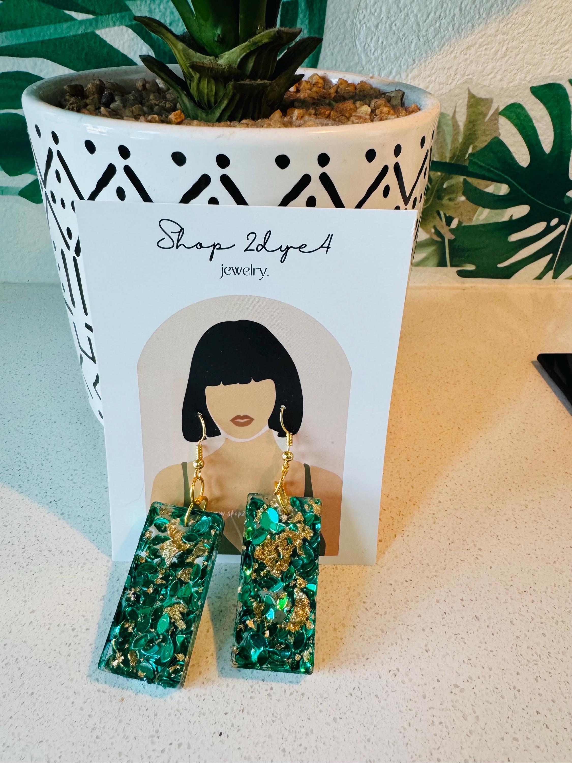 Hand-poured resin encases sparkling emerald sequins and shimmering gold foil, catching the light beautifully with every movement. Lightweight yet eye-catching, they’re finished with gold-plated hooks for an elegant touch.