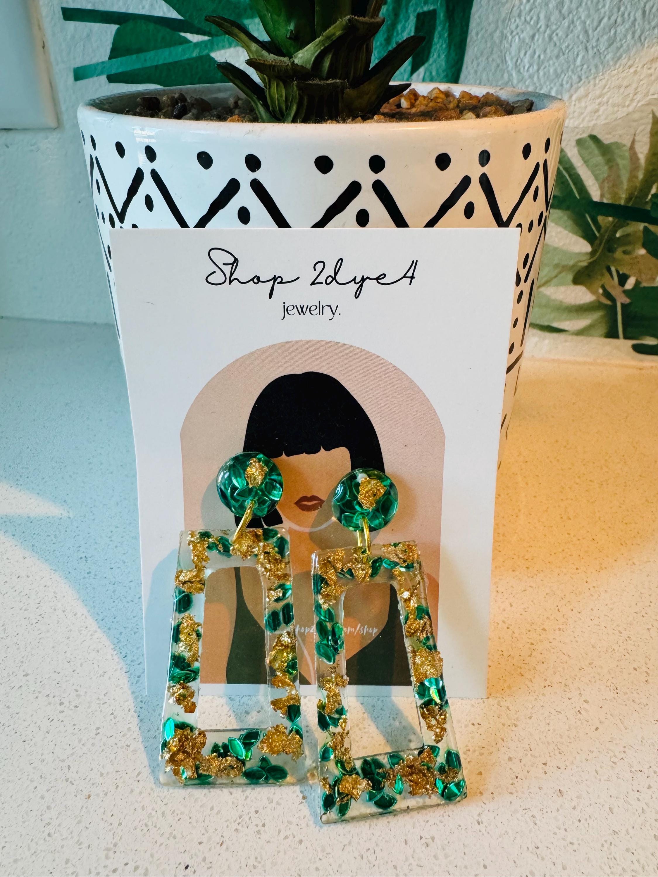 . Each pair is handcrafted with shimmering emerald foil and luxe gold leaf encased in crystal-clear resin, creating a chic geometric silhouette that catches the light beautifully.