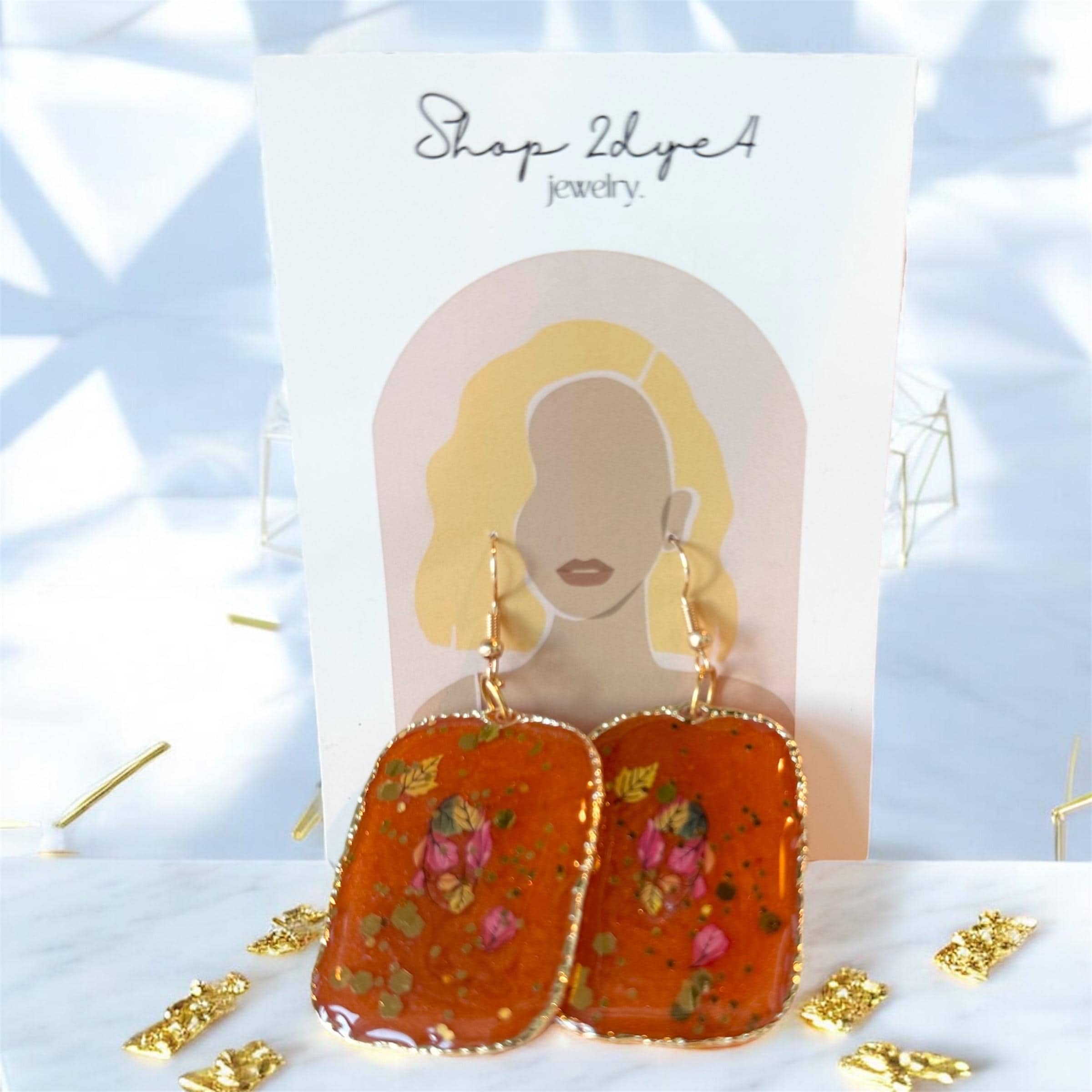 Handcrafted with warmth and elegance, these Autumn Bloom Resin Earrings capture the beauty of fall in every detail. Featuring a deep burnt-orange resin base with gold flakes and pressed floral accents, each pair glows like autumn sunlight.