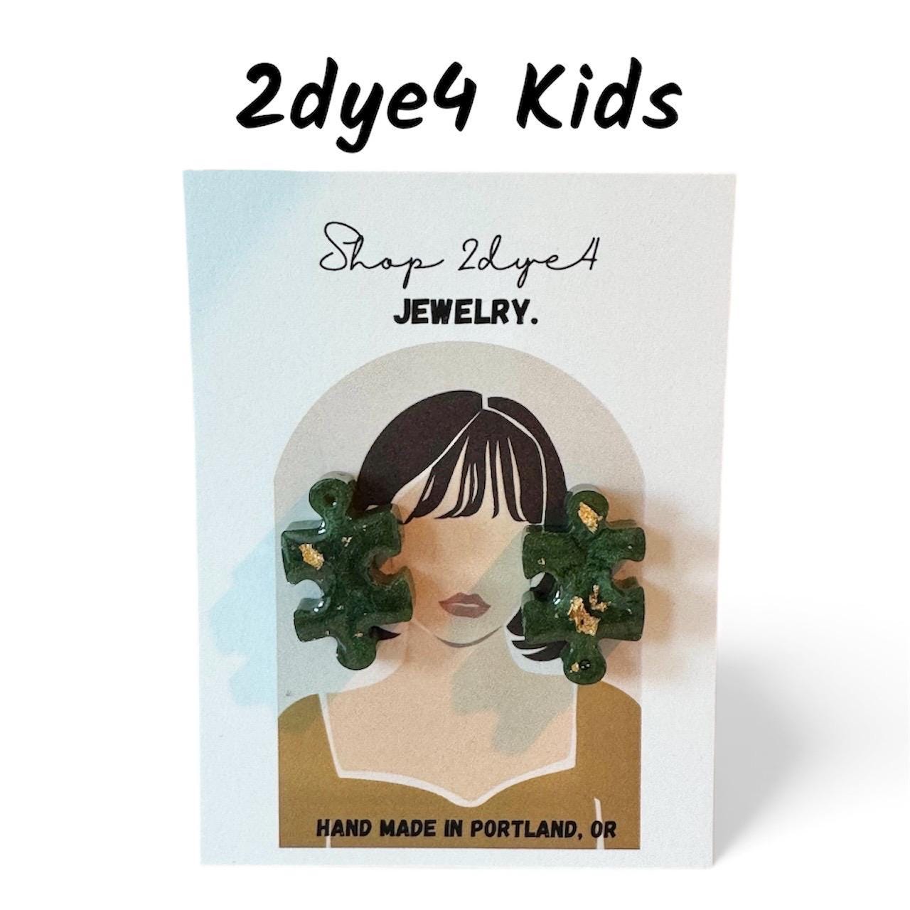 These adorable mini Puzzle Piece Studs are the perfect way for kids to express their personality. Hand-poured with rich forrest green/gold inside smooth resin, each pair brings joy, color, and a touch of magic to any outfit.