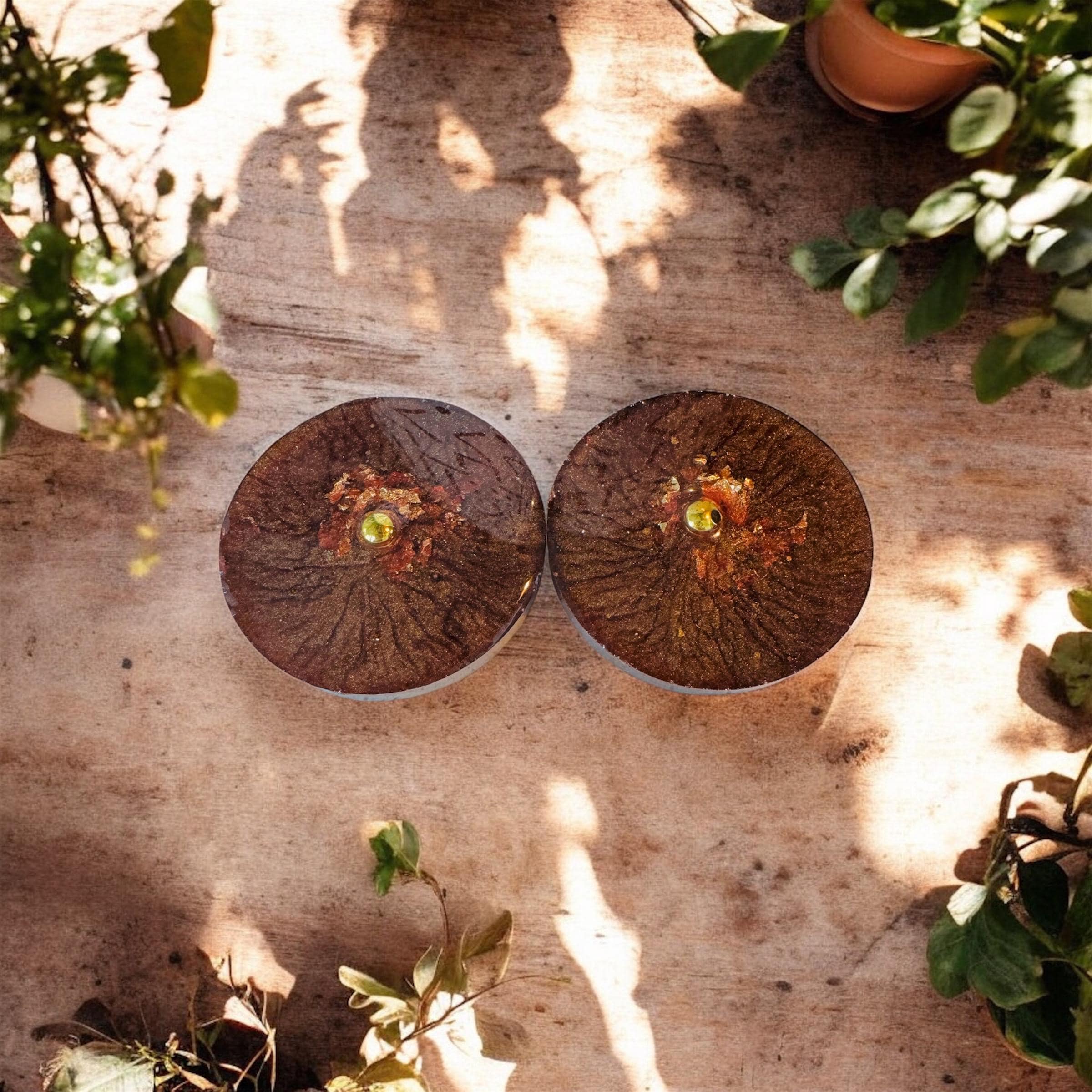 These handcrafted resin earrings feature deep, rich brown tones laced with shimmering bronze and gold leaf accents capturing the warmth and depth of autumn. Each piece is designed to reflect grounded beauty, inner strength, and natural luxury.