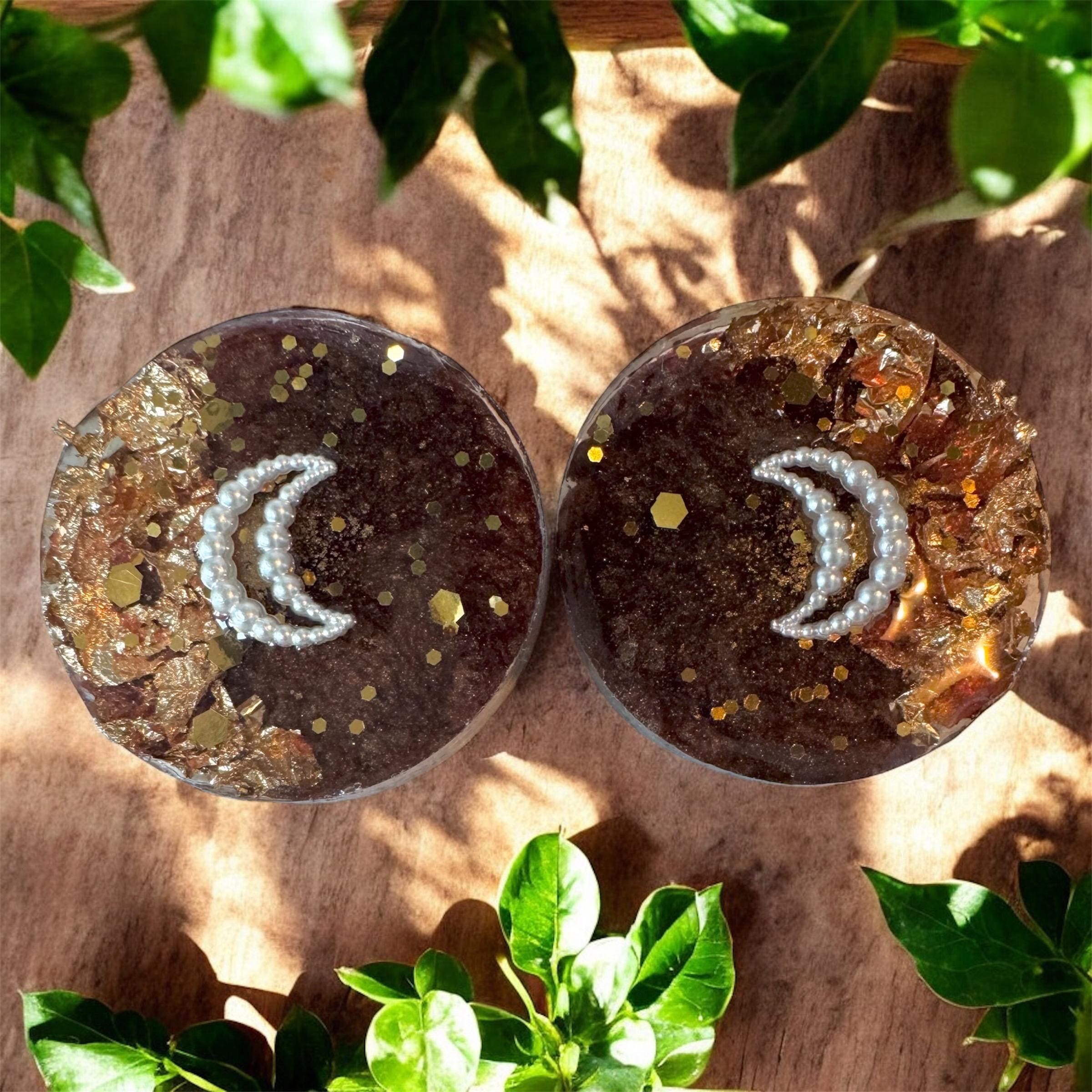 Handcrafted with deep, earthy resin tones, shimmering gold leaf, and a delicate pearl crescent moon, these earrings embody the perfect harmony between nature and divinity.