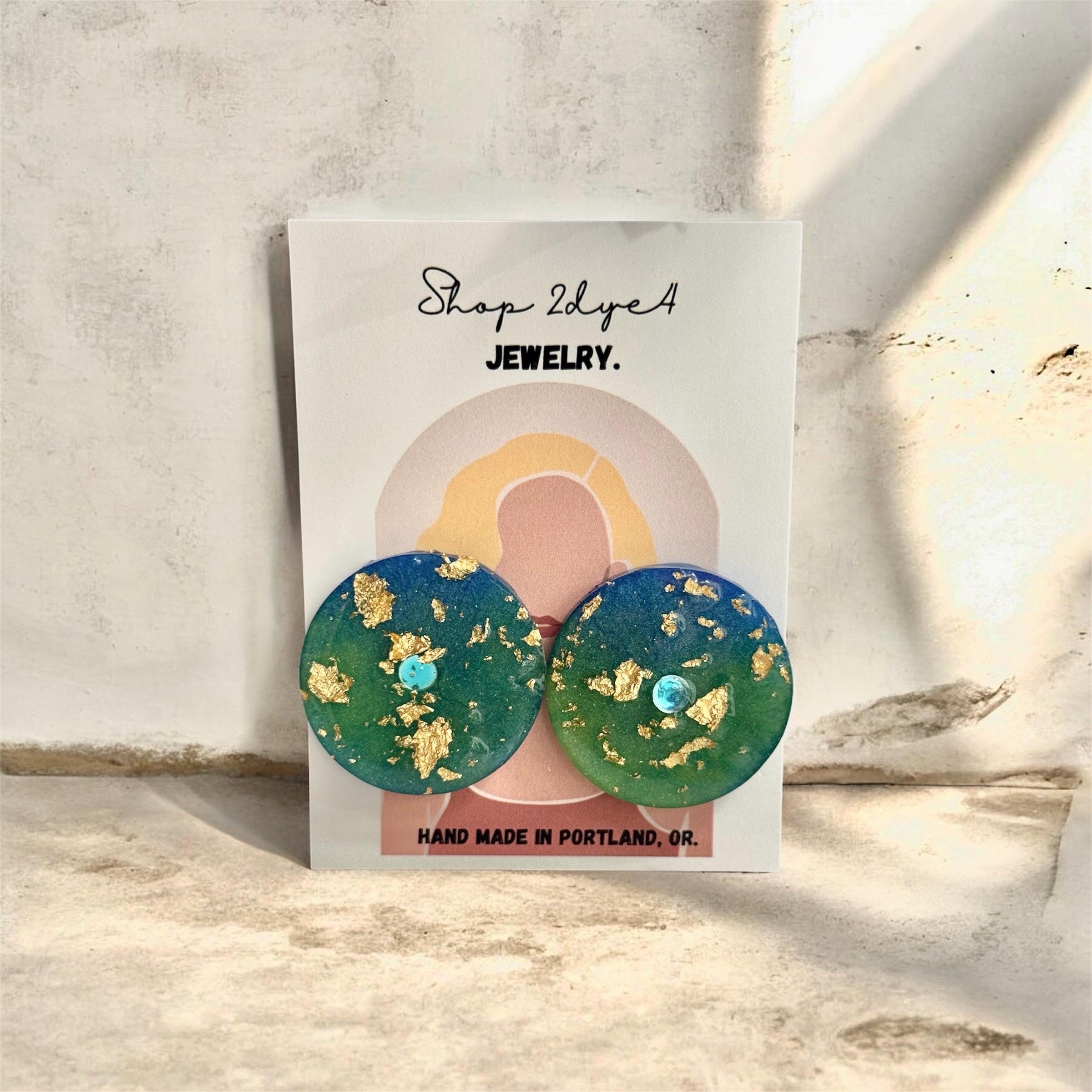 Hand-poured in layered muted blues and soft greens, each disc is finished with scattered gold leaf accents that catch the light without overpowering the design.