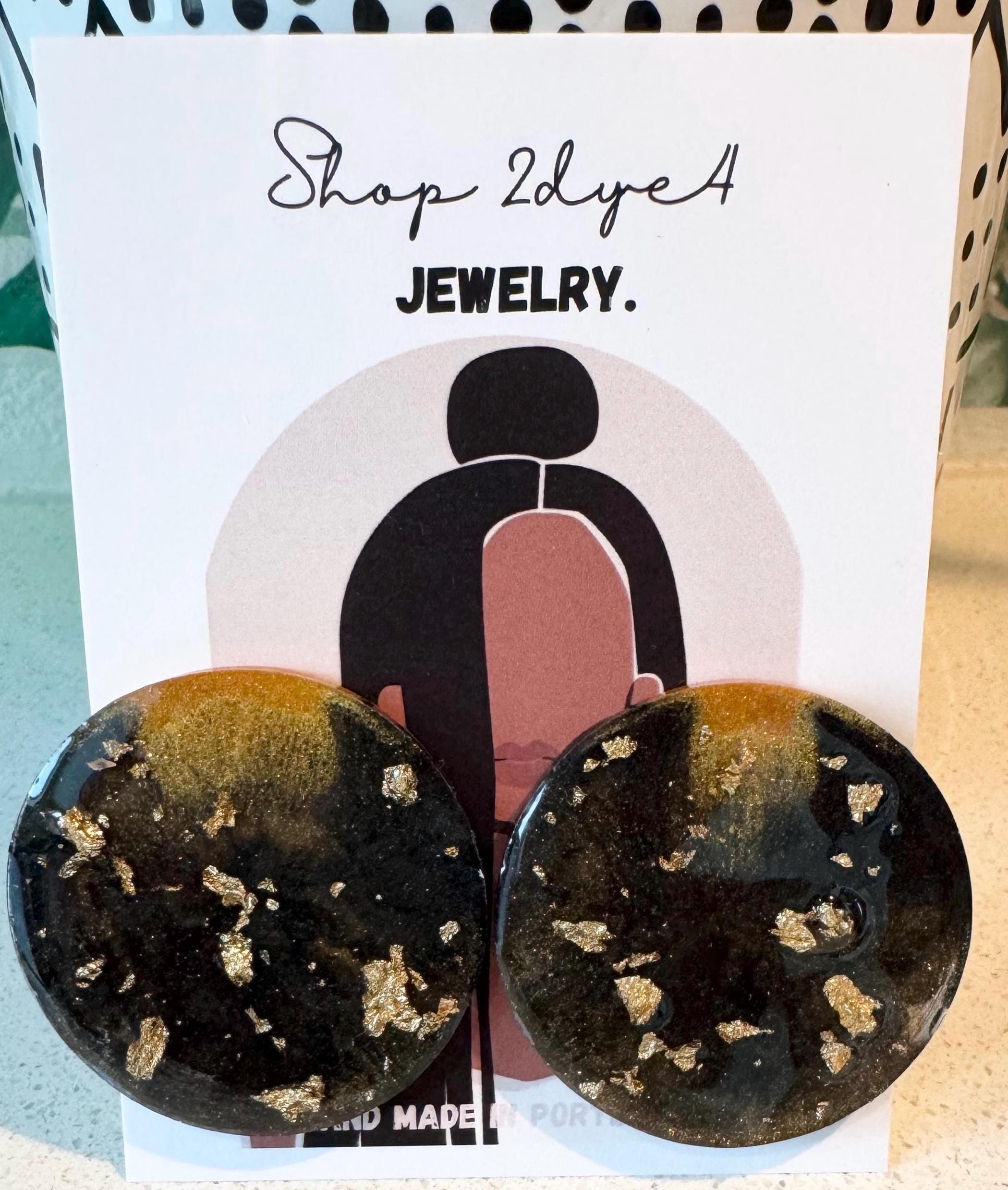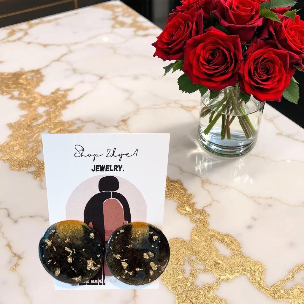 Step into elegance with these Black Alchemy Moon Studs, a bold fusion of midnight black and radiant gold leaf. These earrings capture the essence of transformation — turning darkness into gold.