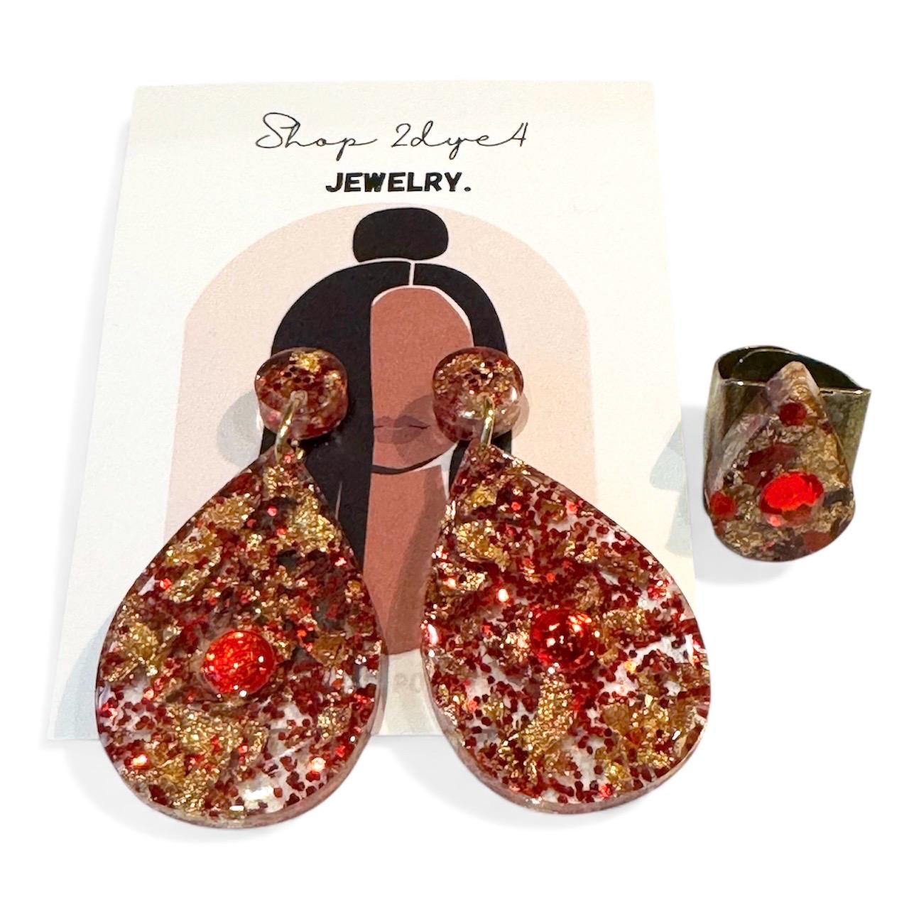 Ignite your look with this bold resin set featuring ruby glitter, gold foil, and a fiery red gemstone—crafted to shimmer and stand out from every angle.