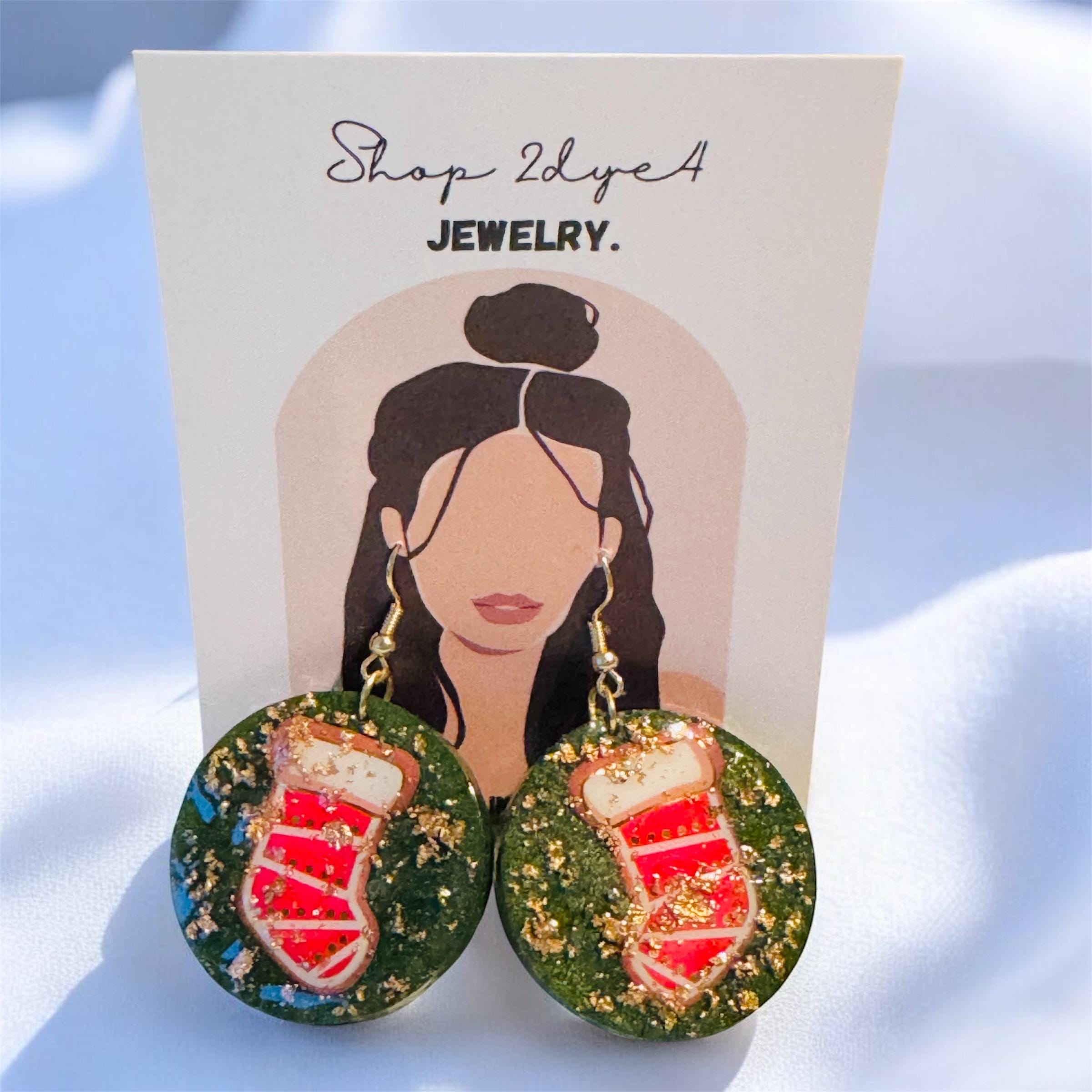 Add a cheerful sparkle to your holiday look with these handcrafted resin earrings featuring adorable Christmas stockings!